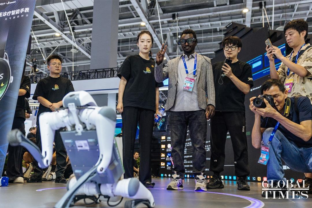 Participants to the 4th Global Digital Trade Expo watch a robotic dog on September 25, 2025, in Hangzhou, East China's Zhejiang Province. The expo, held from September 25-29, includes a main pavilion named "future tech arena" and seven themed zones - AI, digital culture & entertainment, smart mobility, and more - showcasing advanced technologies such as generative AI and multimodal sensory interaction. Photo: Li Hao/GT
