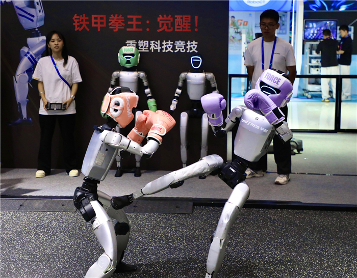 一个人形机器人戴着紫色拳套,正迅猛出击,而它的对手,一个戴着橙色拳套的机器人,则进行灵活格挡。它们的每一个动作都精准而有力,不是电影里的特效,而是真实上演的科技“对决”。
