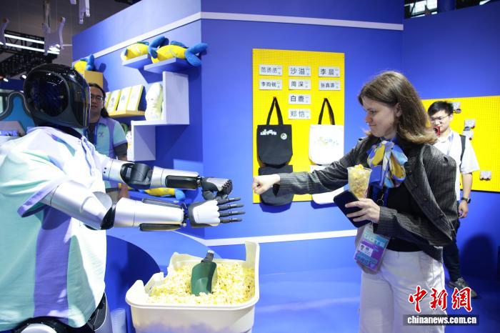 9月25日,第四届全球数贸会主题展区,国际客商与现场展出的人形机器人互动。孙杨洋 摄