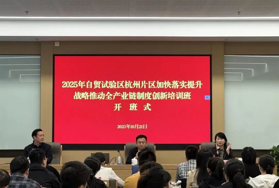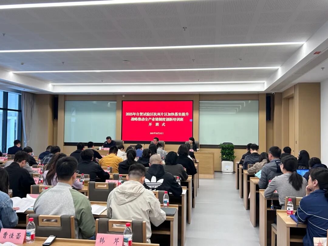 为进一步深化认识、凝聚共识、提升能力,为杭州数字自贸区建设注入新动能、锻造硬支撑,10月21日—23日,由杭州市商务局主办的2025年自贸试验区杭州片区加快落实提升战略推动全产业链创新培训班(以下简称“培训班”)在中共杭州市委党校余杭分校举办。杭州市商务局党组书记、局长,杭州自贸片区管委会主任王永芳作开班动员讲话。来自市商务局、市委网信办、市委金融办、市发展改革局等多个市级部门和各区县(市)商务部门的60余名学员参加培训。
